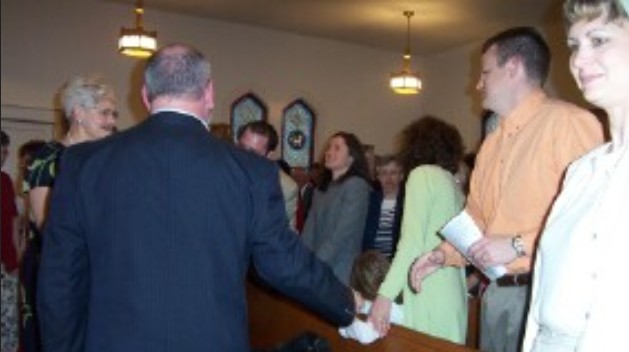 Actually, ‘tarry’ is ekdechomai – to wait, looking with expectation. Now, without side-tracking into word translation debates or being accused of bad exegeses, our point is that this Anglican church’s genuine pre-communion gesture toward one another touched our hearts.