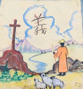 As Dad drew the picture I played and sang, then he spoke on its meaning. These are the Chinese characters (pictures really) for the word ‘redeemed.’ The characters mean ‘Lamb over me’ – the top is a lamb and the bottom character translates ‘me.’