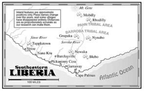 The Garlocks (right) arrived in Liberia and set up camp with a group of African Christians whose tribal boundary touched that of the Pahns. Almost immediately Mrs. Garlock came down with malaria. Their meagre medical chest was soon emptied and still her fever rose. Garlock had a difficult time persuading the natives to take a short route to the coast for more medicine because the way led through Pahn country.