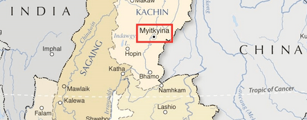 Myanmar map, showing location of Kachin capital, Myitkyina