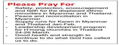 - Please pray for the safety of our co-workers and our brothers and sisters in the Karen villages.