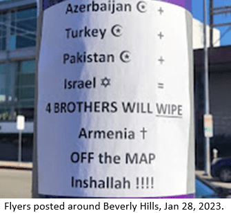 On Saturday 28 January police in Beverly Hills, California, USA, declared that flyers inciting a new Armenian genocide ‘fall within the protection of the First Amendment of the US Constitution’ (i.e. they are protected as free speech). The flyers, which read – ‘Azerbaijan + Turkey + Pakistan + Israel = 4 BROTHERS WILL WIPE Armenia OFF the MAP, Inshallah !!!!’ – had been posted throughout the city on 28 January, ahead of the Armenian Youth Federation Western United States’ March for Artsakh. [NOTE: Israel is a key ally and weapons supplier to Azerbaijan.]