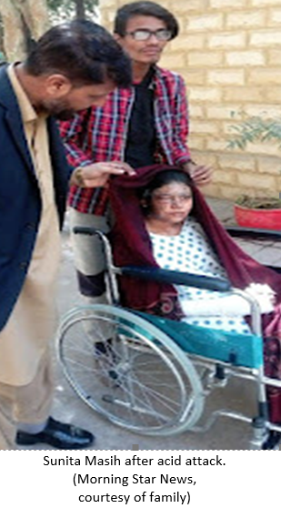 KARACHI:On February 1 a Christian girl named Sunita Masih (19) left home to go to work. While at the bus station, a Muslim neighbour, Kamran Allah Bux threw acid over her, burning her face, eyes, arms and legs. Sunita, who belongs to the local Salvation Army church, will be permanently scared, physically and emotionally. Bux (who is married) had long been harassing Sunita, pressuring her to convert to Islam and marry him – advances she repeatedly rejected. Bux has been arrested and police have registered a case against him.