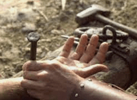 Feeling it, I began weeping, thinking of the scene in that brilliant 1993 movie, The Visual Bible: Matthew, where Jesus (actor Bruce Marchiano) forced to lie down on the cross sees with horror the first nail being hammered in! Oh the petrified look in those saddened eyes!