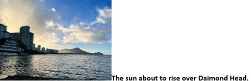 It was our first day back in Hawaii on vacation and with the time change, we were up before dawn. We wandered down to the beach to watch the sun come up. From Waikiki, the sun rises over the famous Diamond Head crater, and it is a sight to behold. We were in crowded company, on a volcanic rock jetty, as the sky began to brighten. Everyone had a camera of some sort, trained to the east.