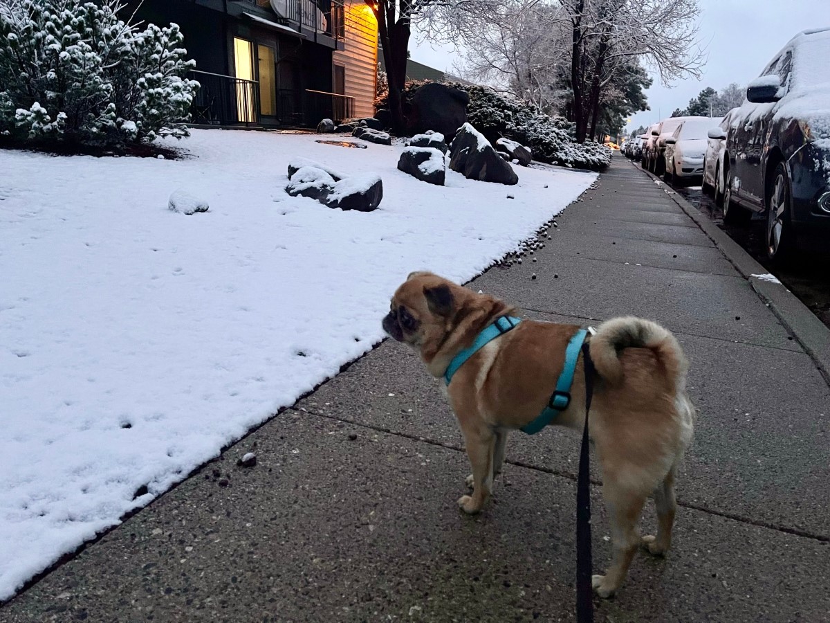 (Photo right: Maka, on our first snowy walk, in our new hometown)