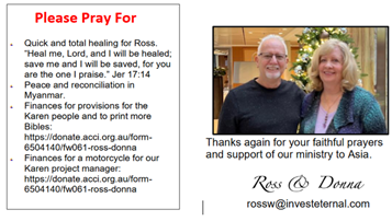 Ross will continue his ministry to churches in Australia until we can get back to Thailand. We are grateful for the opportunities that God has given us to share in some amazing churches,